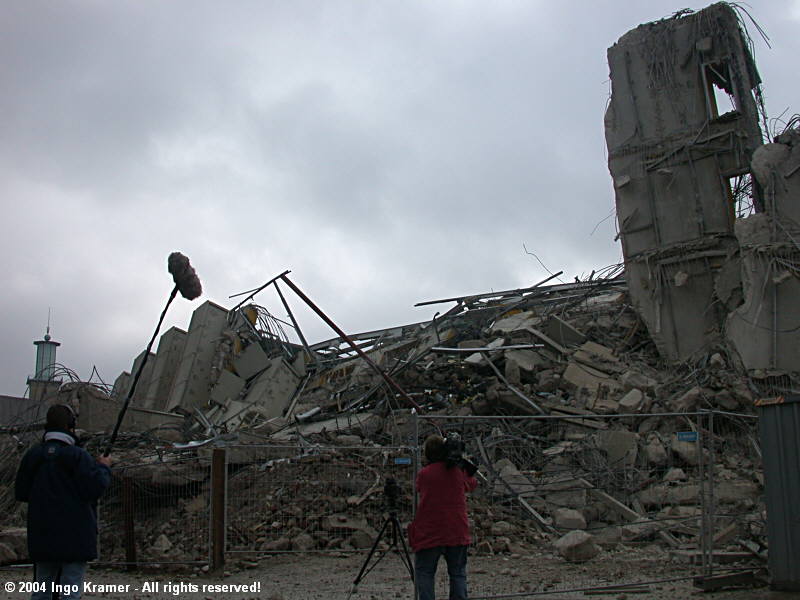 Nach der geglückten Sprengung ein erster Blick auf die Überreste des ehemaligen Sparkassenhochhauses und die evakuierte Umgebung