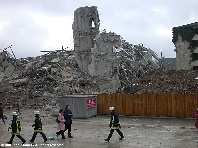 Nach der geglückten Sprengung ein erster Blick auf die Überreste des ehemaligen Sparkassenhochhauses und die evakuierte Umgebung