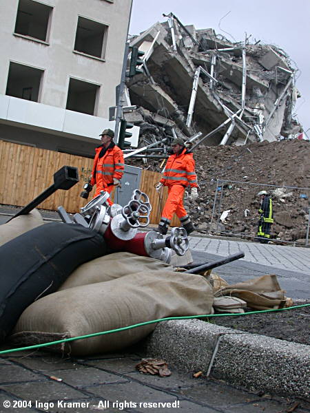 Nach der geglückten Sprengung ein erster Blick auf die Überreste des ehemaligen Sparkassenhochhauses und die evakuierte Umgebung