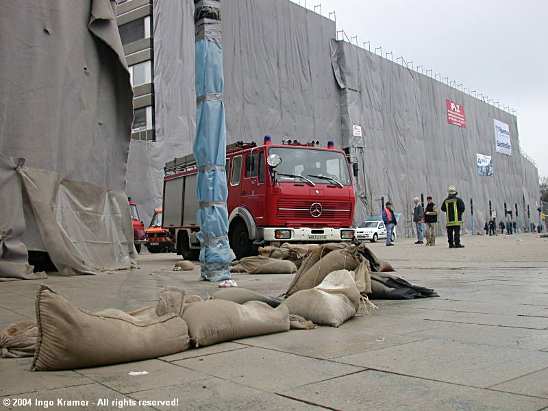 Nach der geglückten Sprengung ein erster Blick auf die Überreste des ehemaligen Sparkassenhochhauses und die evakuierte Umgebung
