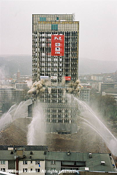 Nach fast einstündiger Verspätung sprengt die Thüringer Spreng das einstige Hagener Wahrzeichen, das ehemalige Sparkassenhochhau