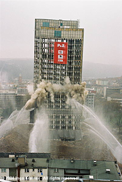 Nach fast einstündiger Verspätung sprengt die Thüringer Spreng das einstige Hagener Wahrzeichen, das ehemalige Sparkassenhochhau