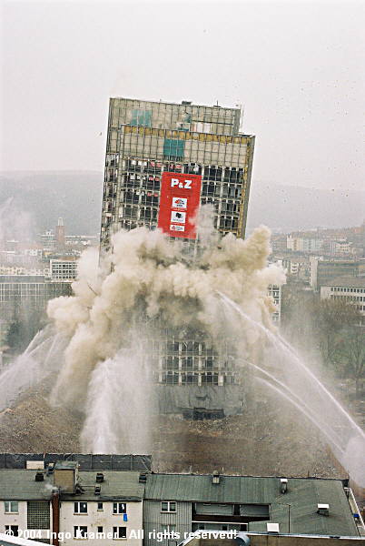Nach fast einstündiger Verspätung sprengt die Thüringer Spreng das einstige Hagener Wahrzeichen, das ehemalige Sparkassenhochhau