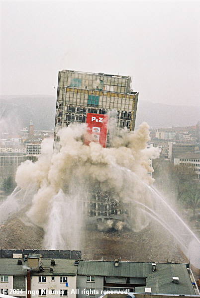 Nach fast einstündiger Verspätung sprengt die Thüringer Spreng das einstige Hagener Wahrzeichen, das ehemalige Sparkassenhochhau