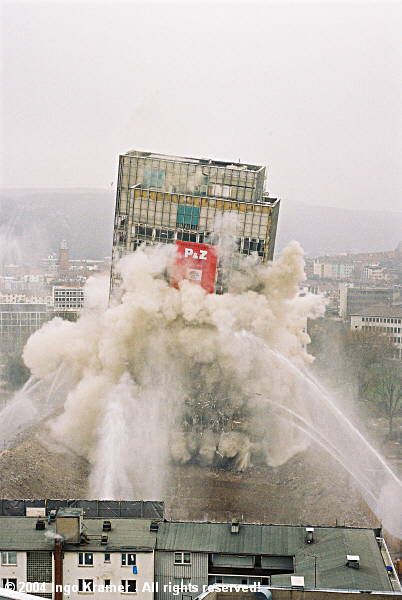 Nach fast einstündiger Verspätung sprengt die Thüringer Spreng das einstige Hagener Wahrzeichen, das ehemalige Sparkassenhochhau