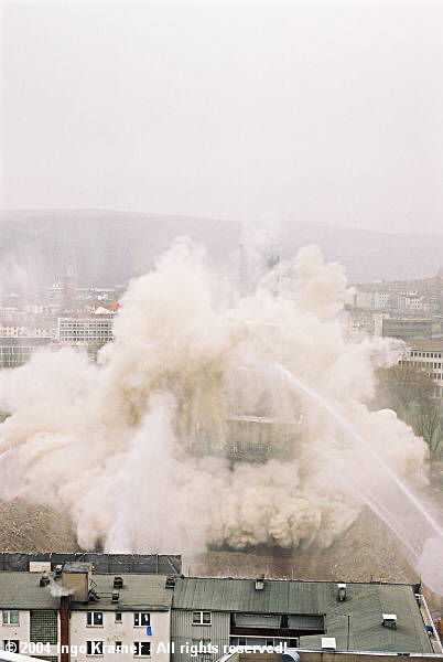 Nach fast einstündiger Verspätung sprengt die Thüringer Spreng das einstige Hagener Wahrzeichen, das ehemalige Sparkassenhochhau