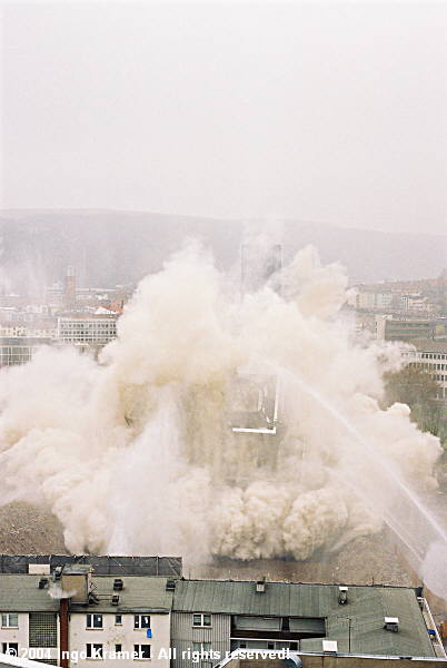 Nach fast einstündiger Verspätung sprengt die Thüringer Spreng das einstige Hagener Wahrzeichen, das ehemalige Sparkassenhochhau