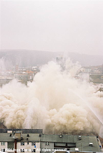 Nach fast einstündiger Verspätung sprengt die Thüringer Spreng das einstige Hagener Wahrzeichen, das ehemalige Sparkassenhochhau