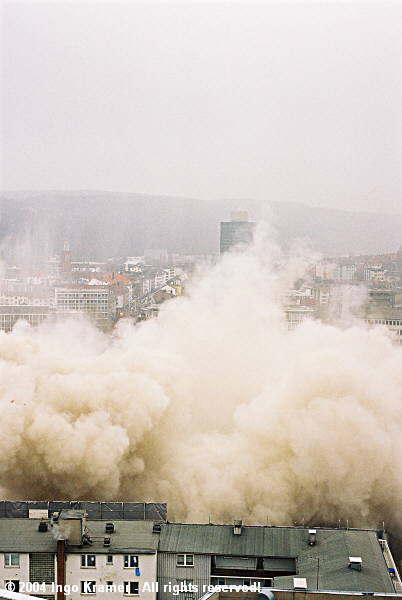 Nach fast einstündiger Verspätung sprengt die Thüringer Spreng das einstige Hagener Wahrzeichen, das ehemalige Sparkassenhochhau