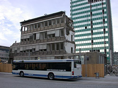 Vor der Sprengung am 7. März 2004 musste die vorgehängte Fassade des Langen Oskars demontiert werden. Damit wurde in der ersten